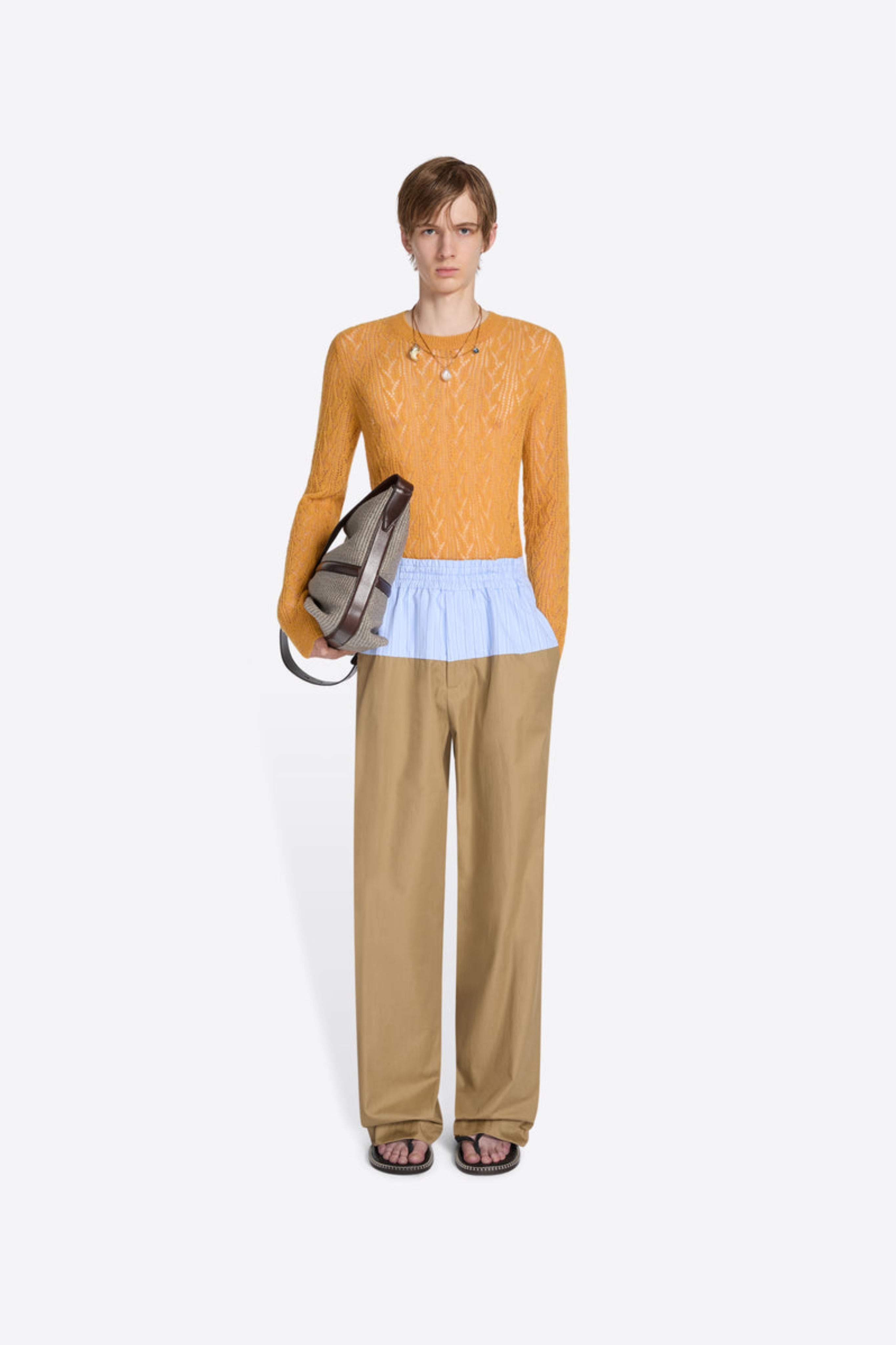 マイクロサンドコットンツイルを使用した、ルーズフィットのハイウエストパンツ。上部にコントラストパネル、伸縮性ウエストバンドが特徴です。